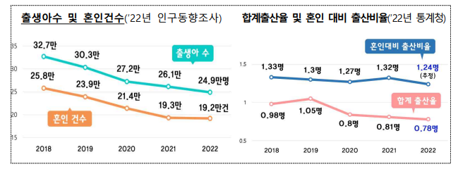 ㅇ 비혼·만혼 경향이 심화되는 상황에서 혼인 대비 출산비율(’ 18년 1.33→ ’ 22년 1.24)도 감소 추세로 결혼을 해도 출산을 하지 않는 경향이 나타나고 있습니다.