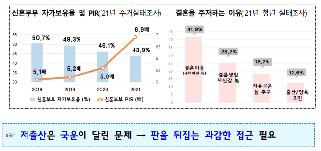 주택가격의 상승과 부담으로 결혼과 생활유지에 부담을 느낀 청년세대들이 결혼을 미루거나 포기하는 심각한 사회문제로 정부에서는 이를 해결하기 위하여 많은 정책들을 연구 중입니다.