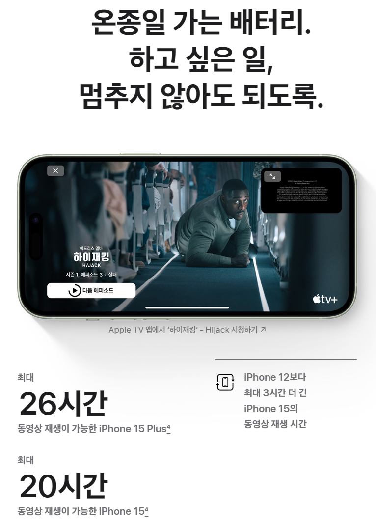 배터리 수명 역시 향상되어 최대 26시간 동영상 재생이 가능한 iPhone 15 Plus와 최대 20시간 동영상 재생이 가능한 iPhone 15이 제공됩니다.