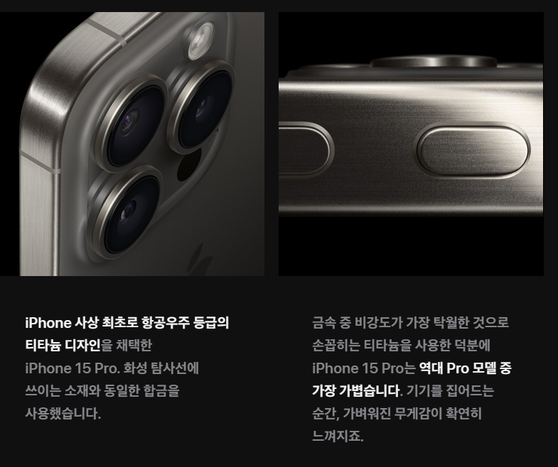 iPhone 15 Pro는 항공우주 등급의 티타늄 디자인을 채택하여 가볍고 강력한 디자인을 제공합니다. 이 합금은 금속 중에서 비강도가 가장 뛰어나며 iPhone 15 Pro를 가볍게 만들어 줍니다.