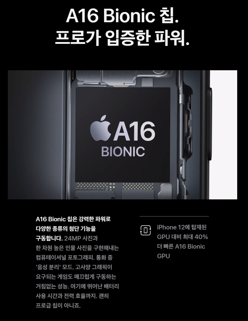A16 Bionic 칩은 강력한 성능을 제공하며, 컴퓨테이셔널 포토그래피, 음성 분리 모드, 고사양 게임 구동 등 다양한 기능을 원활하게 실행할 수 있습니다. GPU 성능도 iPhone 12 대비 최대 40% 빨라졌습니다.