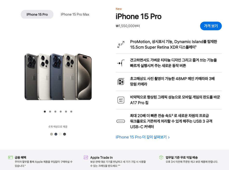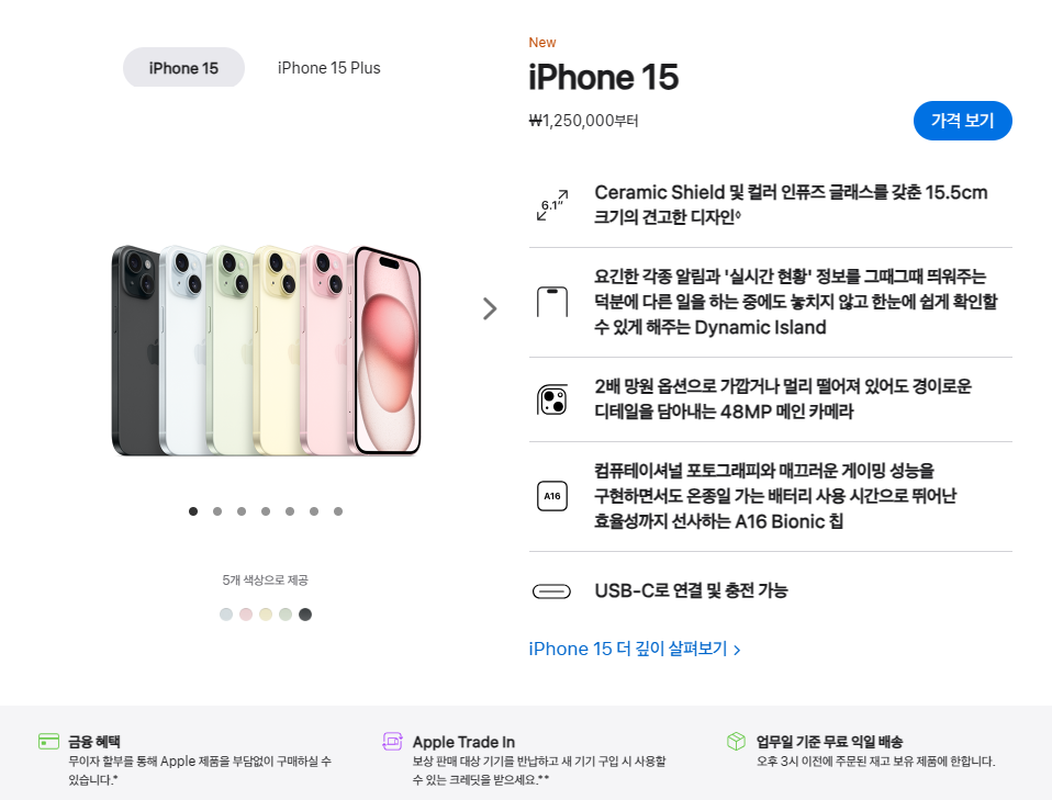 애플 공식 홈페이지에서 애플의 최신 스마트폰인 아이폰 15에 대해 확인해 보시기 바랍니다.