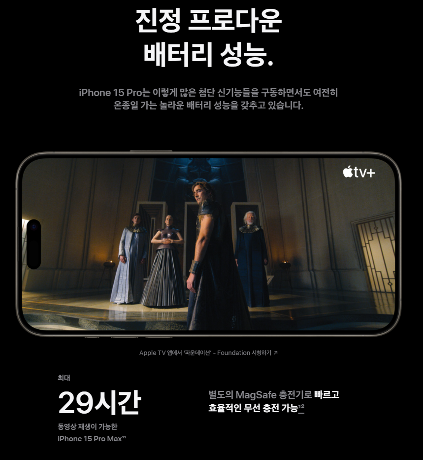 배터리 성능 역시 뛰어나며 모든 첨단 기능들을 구동하면서도 온종일 사용 가능합니다. 이러한 혁신적인 기능들로 iPhone 15 Pro는 진정한 프로 스마트폰으로 소개됩니다.
