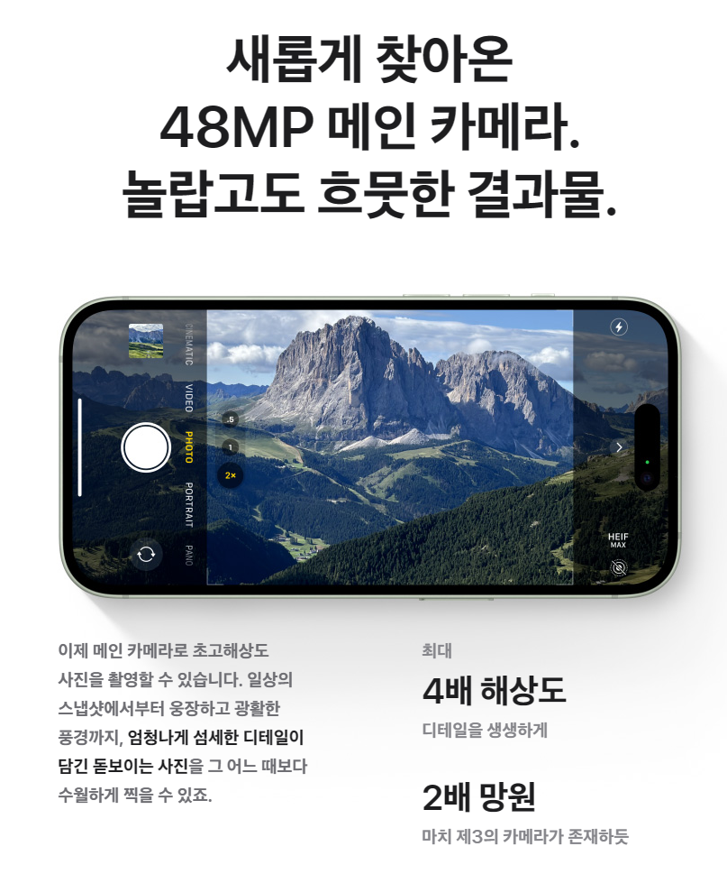또한, iPhone 15에는 48MP 메인 카메라가 탑재되어 더 뛰어난 사진 품질을 제공합니다. 최대 4배의 해상도로 디테일을 생생하게 담아내며, 초점을 찍은 후에도 원하는 피사체로 초점을 옮길 수 있어 더 다양한 인물 사진을 찍을 수 있습니다.