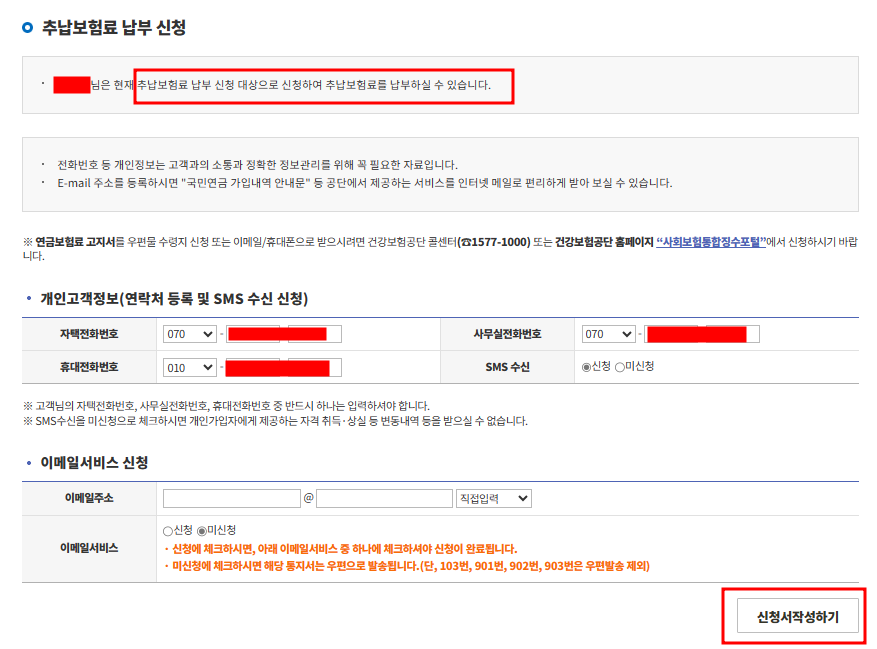 - 화면처럼 XXX님은 현재 추납보험료 납부 신청 대상으로 신청하여 추납보험료를 납부하실 수 있습니다.