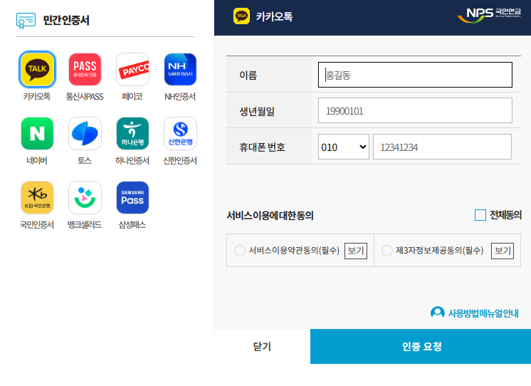 여러 가지 인증방법중, 좌측에서 카카오톡을 선택하고, 우측에서 본인의 인증정보를 입력하여 인증합니다.