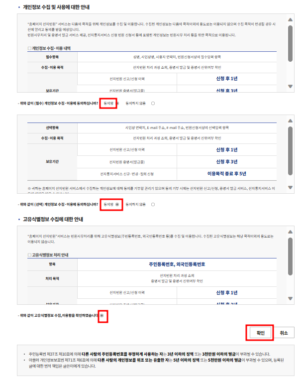 - 개인정보 수집에 동의하고 확인을 클릭하여 계속 진행합니다.