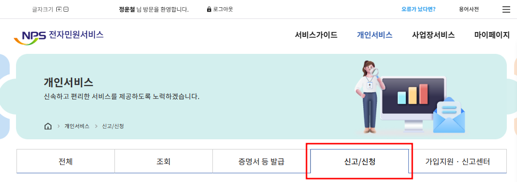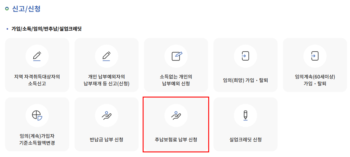 3. 인증이 완료되어, 정상적으로 로그인이 되면 신고/신청 - 추납보험료 납부신청을 클릭합니다.