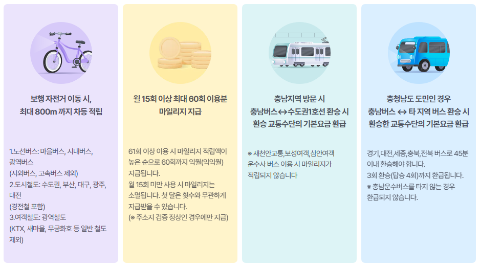 대중교통 1회 이용 시 이동거리 최대 800m까지 인정되며, 월 15회 미만 이용 시 적립액은 소멸됩니다. 충남지역 방문 시 충남운수사 환승요금은 마일리지로 적립되며, 충남도민인 경우 추가로 환승혜택을 받을 수 있습니다.