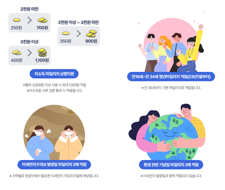 | 만 19세 ~ 34세 청년 마일리지 | 최대 350원 | 최대 500원 | 최대 650원 |
