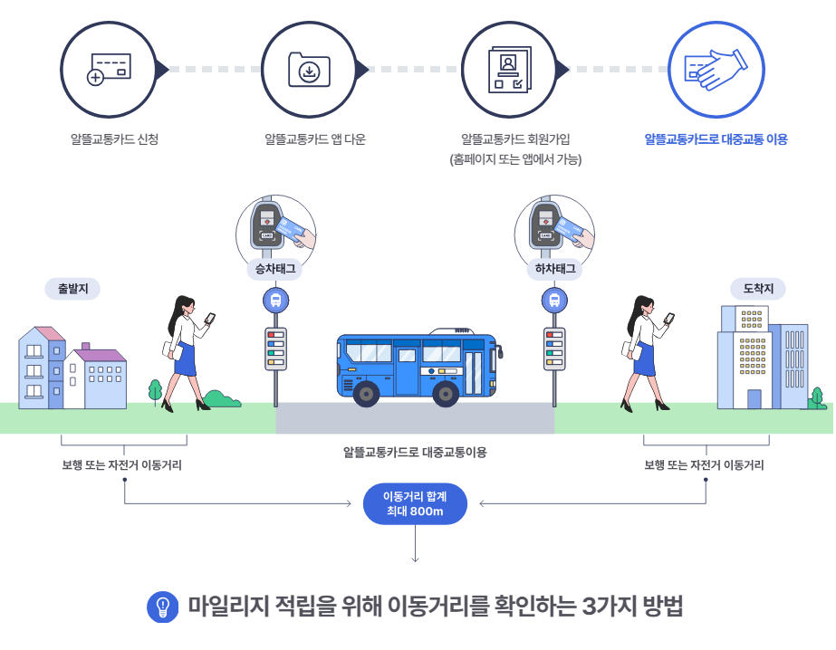 알뜰교통카드를 사용하여 대중교통 이용 시 출발지에서 승차점까지 이동거리, 하차점에서 도착지의 이동거리의 합으로 마일리지를 적립할 수 있습니다.