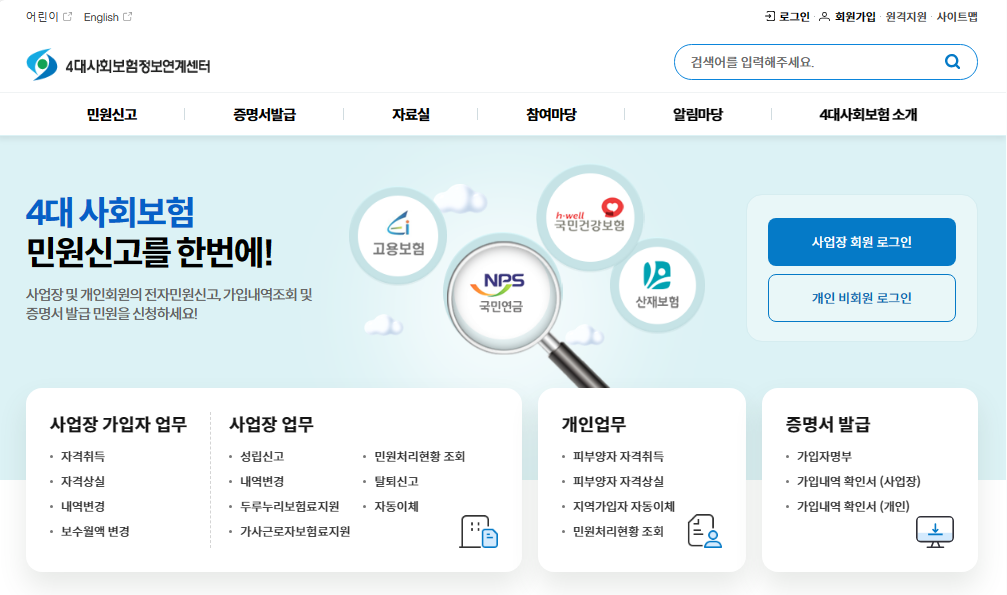 온라인 신청은 4대사회보험정보연계센터 웹사이트를 이용합니다.