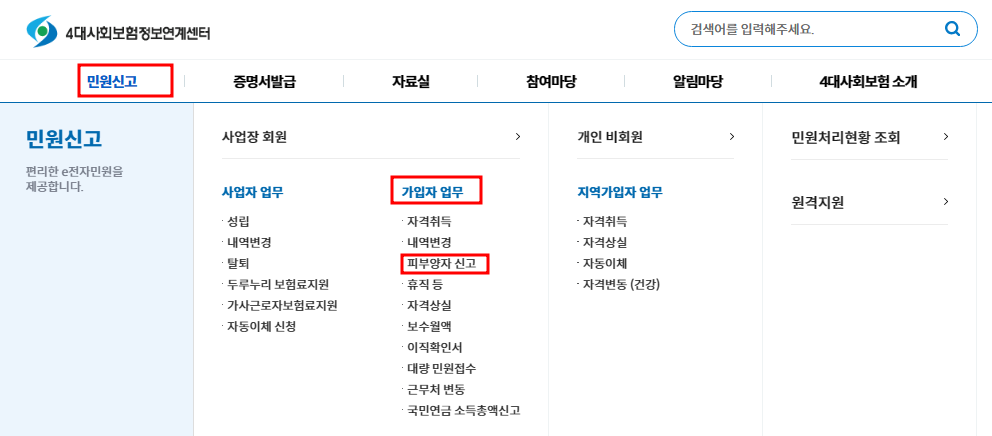- 화면과 같이 민원신고 / 가입자 업무 / 피부양자 신고를 클릭합니다.