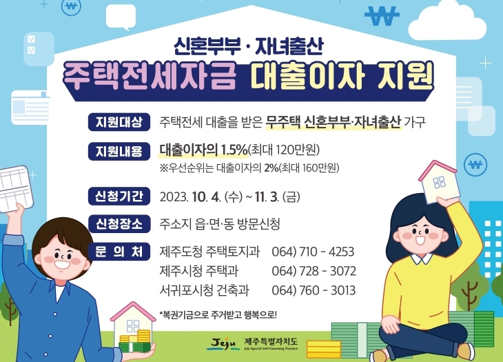 [한라일보] 신혼부부와 자녀출산 가구 등에 대한 전세자금 대출이자가 지원된다.제주특별자치도는 2023년 4차 신혼부부·자녀출산 가구 주택전세자금 대출이자 지원사업을 추진한다고 4일 밝혔