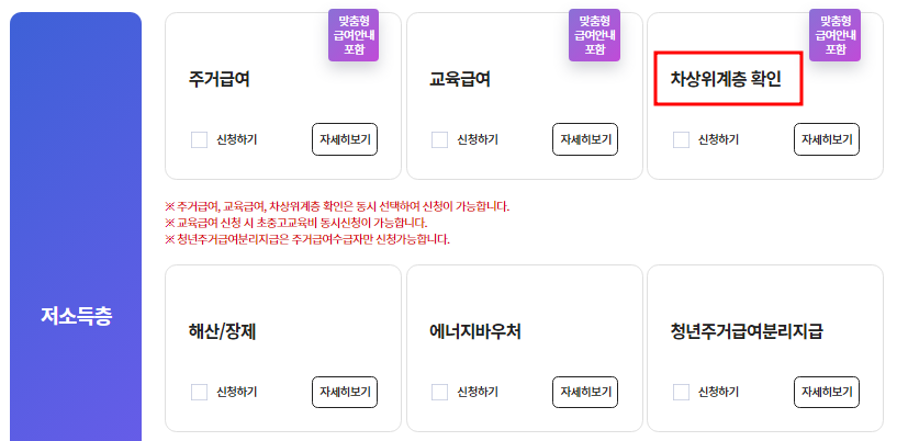 4. 그다음 화면을 스크롤하여 저소득층 부분에 있는 차상위계층 확인을 클릭합니다.
