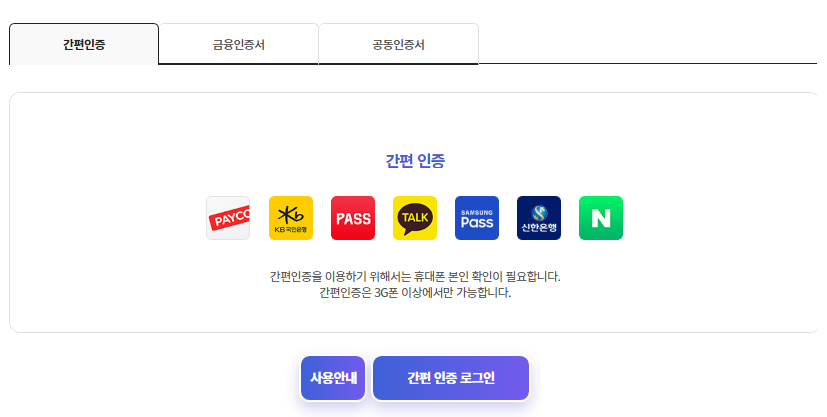 공인인증서 또는 간편 인증을 이용하여 로그인합니다.