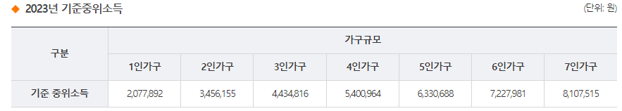 | 중위소득50% | 1,038,946원 | 1,728,077원 | 2,217,408원 | 2,700,482원 | 3,165,344원 | 3,613,991원 | 4,053,758원 |