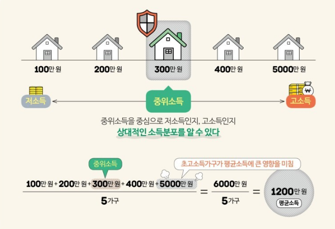 기준중위소득이란 우리나라 가구소득을 순서대로 나열했을 때, 중간이하에 해당하는 가구를 말합니다.