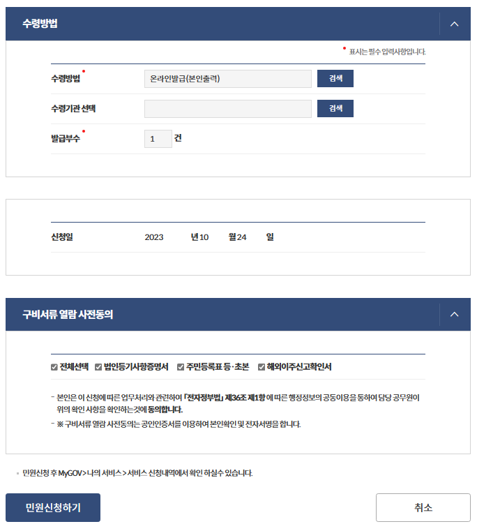 6. 수령방법을 온라인발급(본인출력)으로 선택합니다.