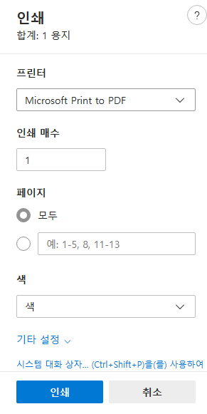 12. 프린터가 없으면 Microsoft Print PDF를 선택하고, 하단의 인쇄 버튼을 클릭하면 됩니다.