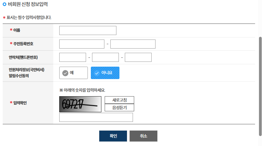 4. 비회원 신청이어도 자료조회 및 이용에 필요한 정보는 정확히 입력하고 인증을 마쳐야 이용이 가능합니다.