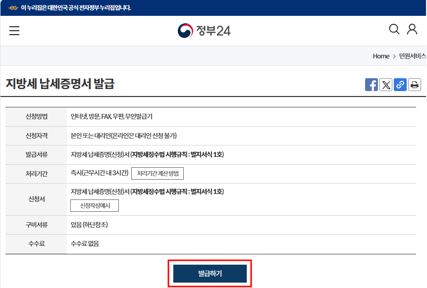 2. 사이트로 이동이 되면, 아래와 같은 화면에서 하단의 발급하기 버튼을 클릭합니다.