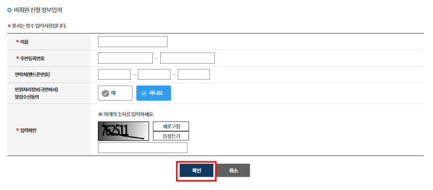 4. 비회원 신청하기 클릭 후 개인정보 수집에 동의 체크 후 아래의 내용을 정확히 입력하고 하단의 확인버튼을 클릭합니다.
