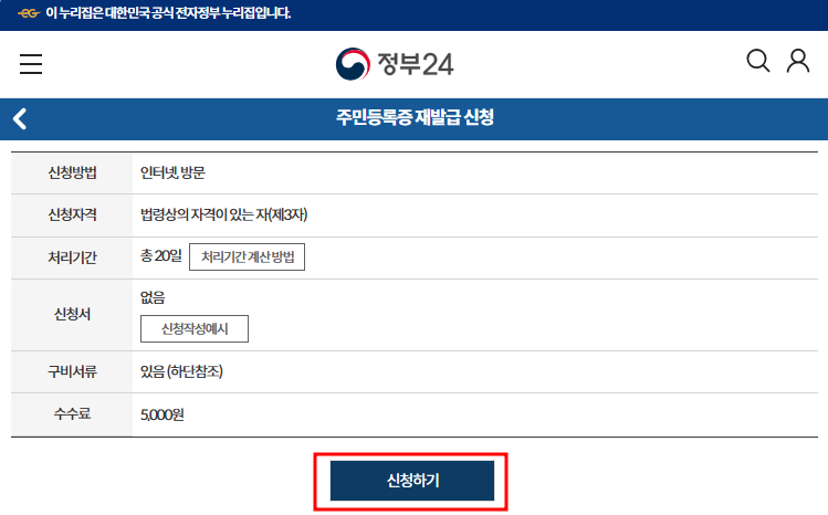 주민센터방문 없이 주민등록증 재발급을 위해서는 정부24 홈페이지를 이용하여야 합니다.