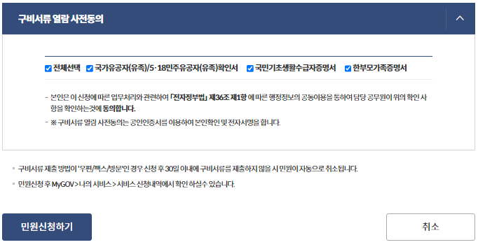 10. 구비서류 열람 사전 동의가 체크된 상태로 [민원신청하기]를 눌러주세요.