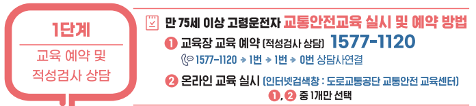 ※만 75세 이상 고령운전자는 치매검사 등을 받고 반드시 교통안전교육을 이수하여야 정기적성검사(갱신)를 받을 수 있습니다.