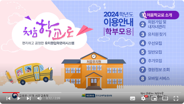 "유치원 입학을 희망하는 보호자가 시간과 장소의 제한 없이 온라인으로 편리하게 유치원에 대한 정보를 검색하고 신청하는 시스템입니다. 이를 통해 유치원은 공정하게 선발된 결과를 투명하게 알려줌으로써 학부모의 편의를 증진하고 교원의 업무 부담을 경감하는 입학지원 시스템입니다."