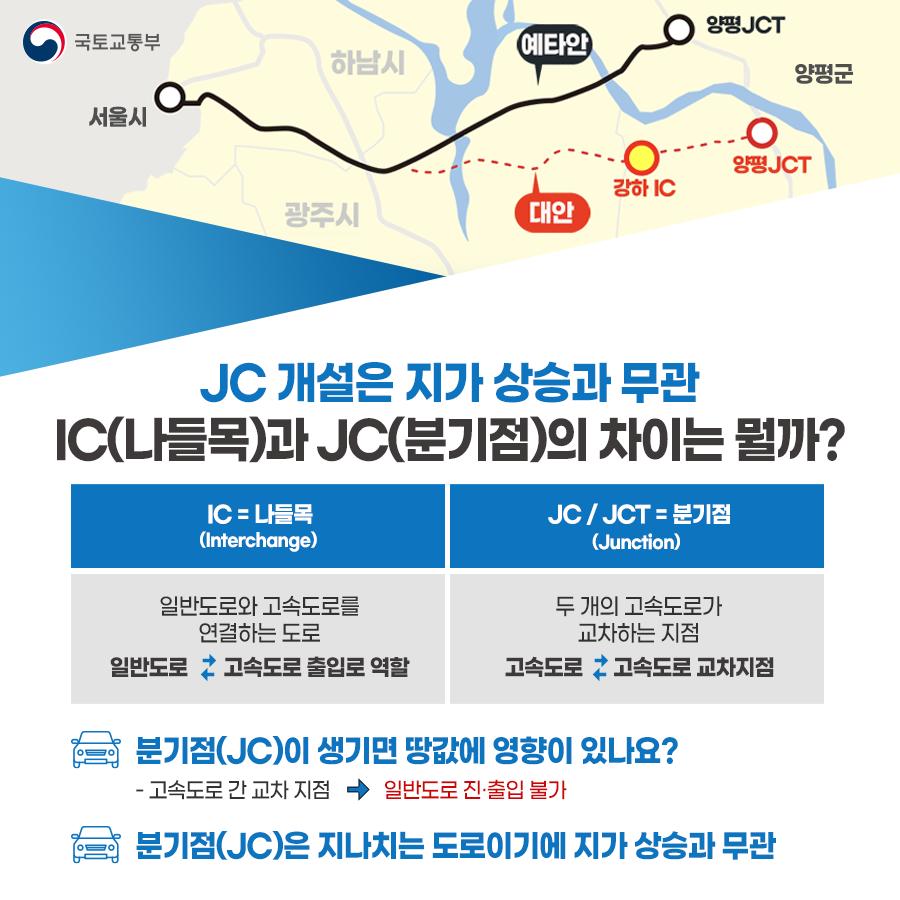 따라서 분기점(JC)은 차량이 지나치는 도로이기에 지가 상승과 무관할 뿐만 아니라 오히려 인근 지역은 소음과 먼지로 땅값에 악영향을 주기만 하는 피해지역으로 여겨져 땅값이 떨어지는 경우가 더 많다고 합니다.