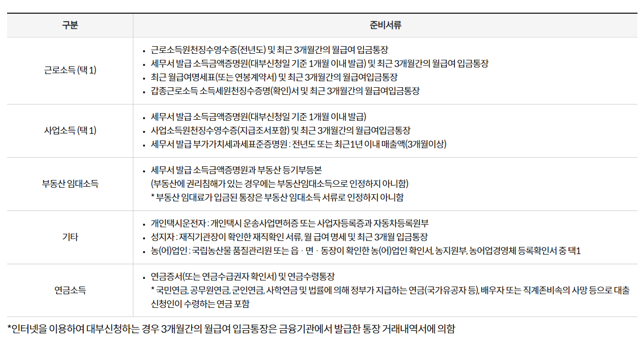 | 국민연금납부내역으로 소득을 확인하는 경우 | - 국민연금 가입자 가입증명 - 최근 1년간 공단 발급 연금보험료 납부확인서 - 자영업자의 경우 사업자등록증 사본 제출 |