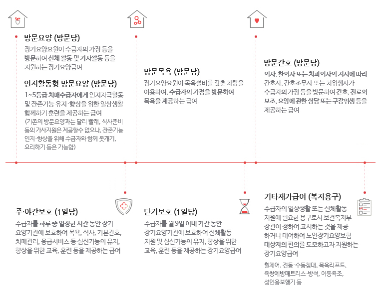 | 재가급여 | 가정 방문 요양, 방문 목욕, 방문 간호, 주야간 보호 서비스 |