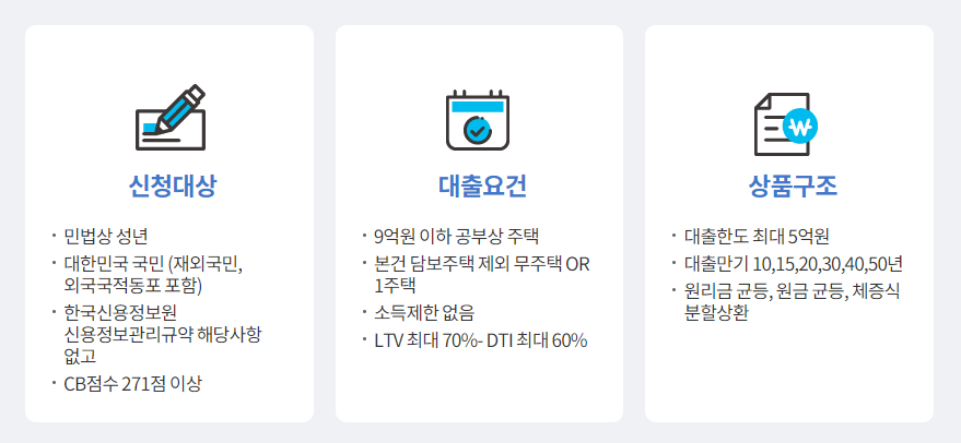 - DSR은 평가하지 않고, LTV와 DTI만 충족하면 대출이 가능한 상품입니다.