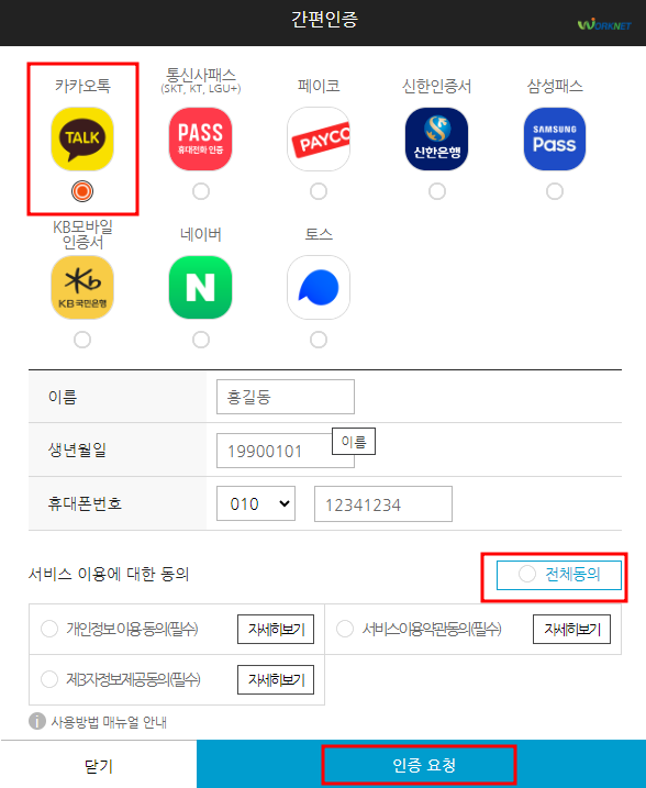 4. 이 화면에서, 카카오톡을 선택하고, 본인의 개인정보를 입력하고, 전체동의에 체크한 후 인증요청을 클릭합니다.