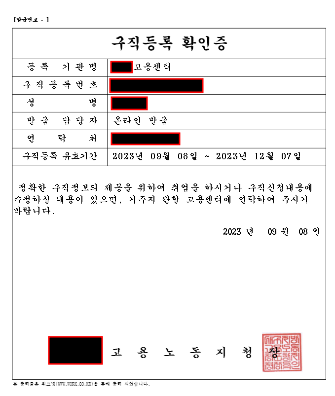 - 위에서 확인을 클릭하면 화면이 전환되면서 아래처럼 구직등록확인증 출력이 보입니다.