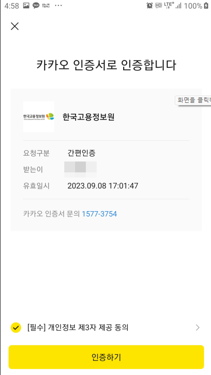 - 다시 개인정보 제공에 동의를 체크하고 인증하기를 클릭합니다.