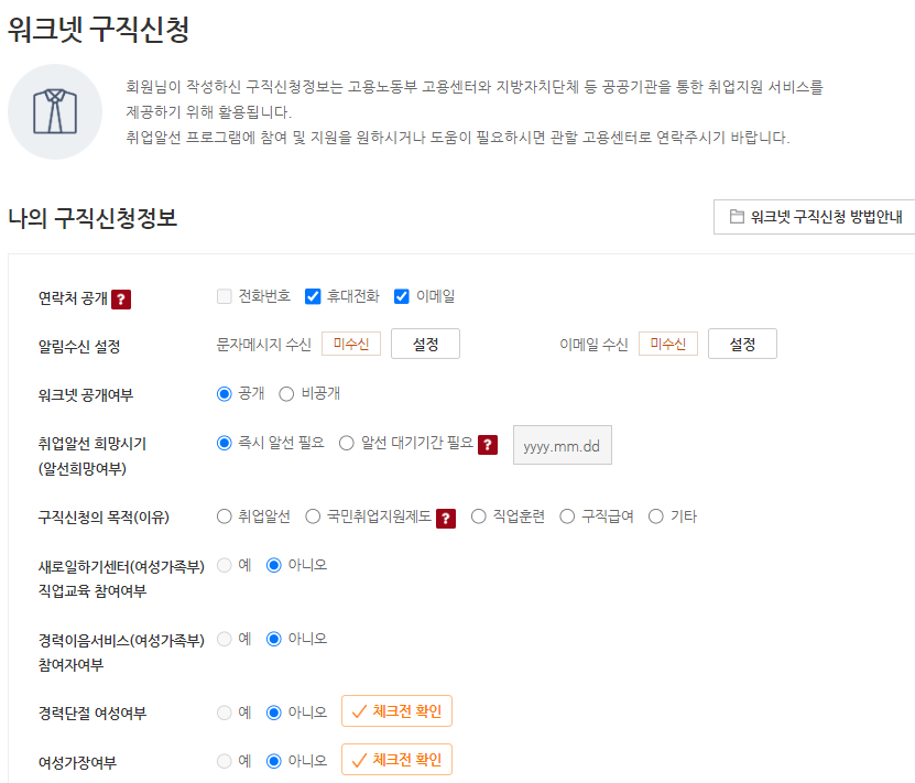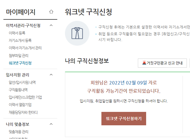 2. 그러면 본인의 구직정보가 나오고, 신청이 안되어 있거나 만료되었다면, 워크넷 구직신청하기를 다시 해야 합니다.