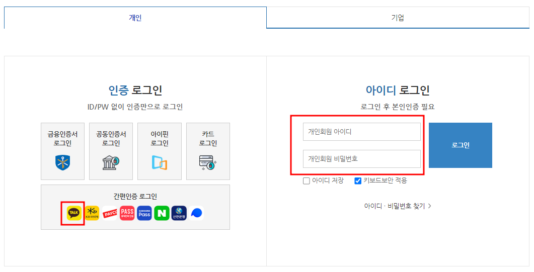 - 인증 로그인에서 카카오톡 이미지를 클릭합니다.