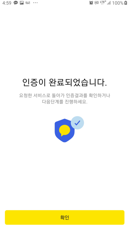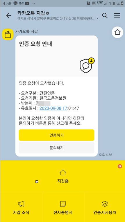 5. 인증요청을 클릭하면 카카오톡으로 메시지가 전달되는데, 카카오톡을 확인합니다.
