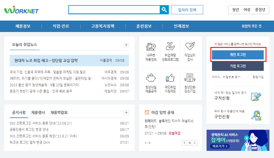 1. 워크넷 공식 홈페이지로 이동하여 로그인을 합니다.