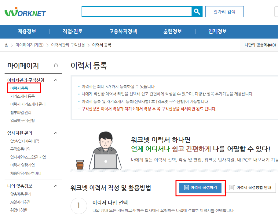 2. 마이페이지에서 이력서 등록을 클릭하고 이력서 작성을 진행합니다.