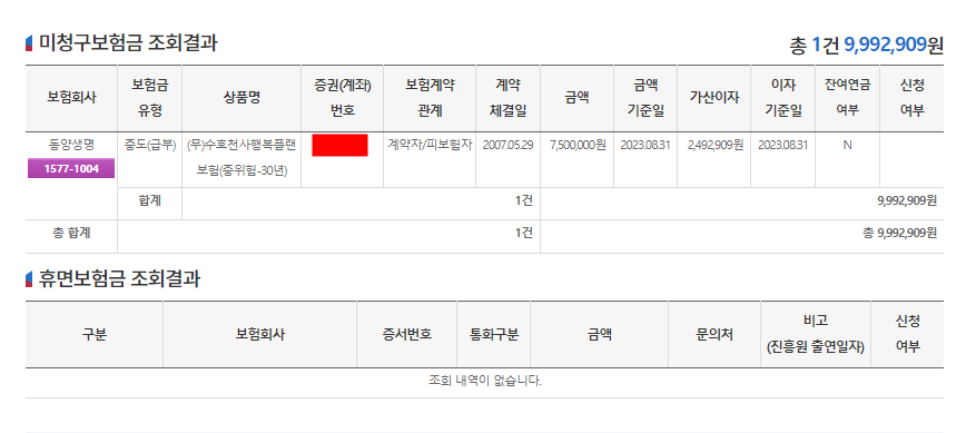 - 미청구 보험이나 휴면보험금이 있다면 아래처럼 내역이 출력됩니다.