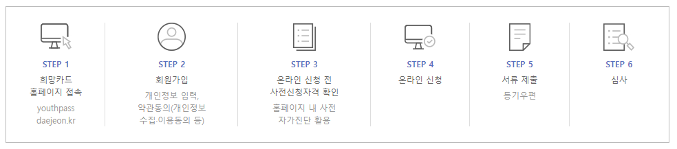 ① 희망카드 홈페이지(youthpassdaejeon.kr) 접속 →② 회원가입 【개인정보 입력, 약관동의(개인정보 수집·이용 동의 등)】→ ③ 온라인 신청 전 신청자격 확인(홈페이지 내 사전 자가진단 활용) →④ 온라인 신청 → ⑤ 신청서류 등기우편 제출 → ⑥ 심사 → ⑦ 선정(홈페이지 공지 및 개별 이메일·문자 통보) → ⑧ 온라인 교육 및 약정체결(필수 이행, 불참 시 최종 탈락) → ⑨ 카드발급 및 포인트 사용 시작